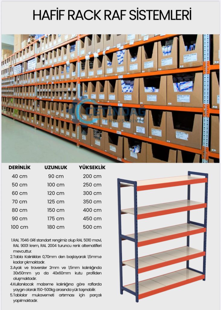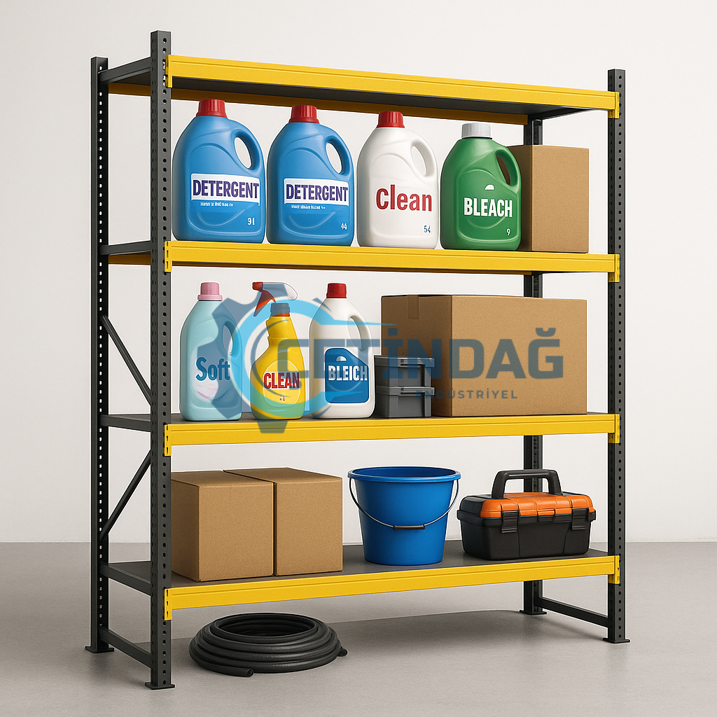 Orta ve hafif yüklerin düzenli depolanması için kullanılan modüler çelik raf sistemleridir.
